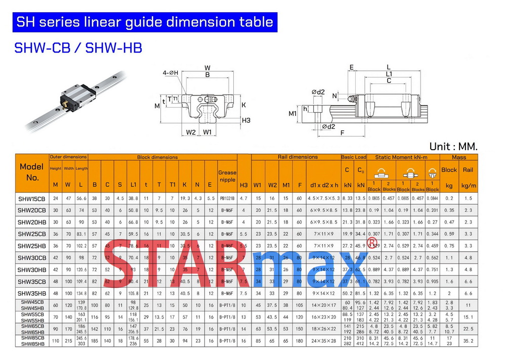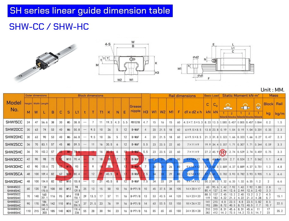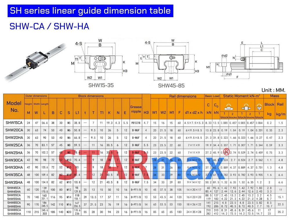 STARmax มี Linear Guide หลากหลายขนาด เช่น SHW15CA SHW20CA SHW20HA SHW25CA SHW25HA