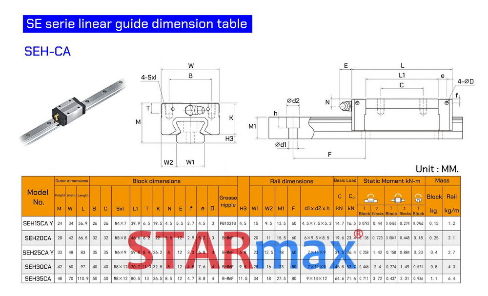 STARmax มี Linear Guide หลากหลายขนาด เช่น SEH15CAY SEH20CA SEH25CAY SEH30CA SEH35CA เป็นต้น พร้อมบล็อกสไลด์หลากหลายแบบให้เลือกตามลักษณะงาน